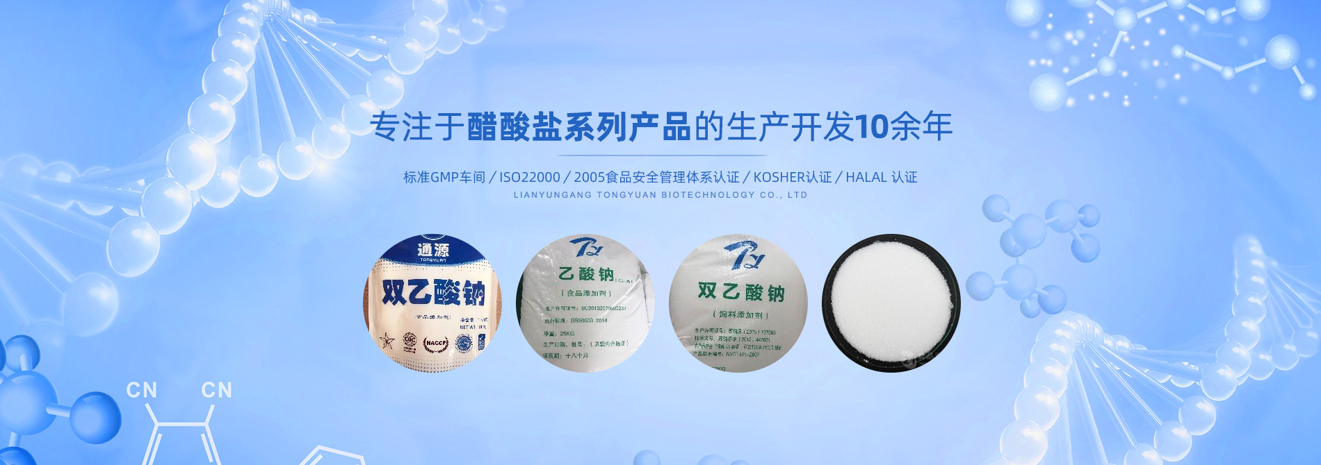 連云港市通源生物科技有限公司 是生產(chǎn)雙乙酸鈉、無(wú)水醋酸鈉、三水醋酸鈉、醋酸鉀、乙酸鈉、丙酸鈉、丙酸鈣和氯化鉀等系類醋酸鹽產(chǎn)品的專業(yè)制造商。公司專注于醋酸鹽系列產(chǎn)品的生產(chǎn)開發(fā)10余年,是國(guó)內(nèi)專業(yè)醋酸酸鹽產(chǎn)品生產(chǎn)基地?! ∧壳?,我們已和全球30多個(gè)國(guó)家和地區(qū)建立長(zhǎng)期的業(yè)務(wù)合作關(guān)系,是中國(guó)較大的雙乙酸鈉生產(chǎn)商和出口商之一。作為中國(guó)食品添加劑和配料協(xié)會(huì)理事單位,通源公司已建成標(biāo)準(zhǔn)GMP車間5000余平方米,通過(guò)了ISO22000:2005食品安全管理體系認(rèn)證、KOSHER認(rèn)證、HALAL 認(rèn)證等,這些都是我們提供高質(zhì)量產(chǎn)品和優(yōu)良服務(wù)的前提和確保。 生產(chǎn)出色產(chǎn)品,提供優(yōu)良服務(wù),滿足顧客需要,是我們努力的目標(biāo)。愿和我們的朋友們攜手,共...